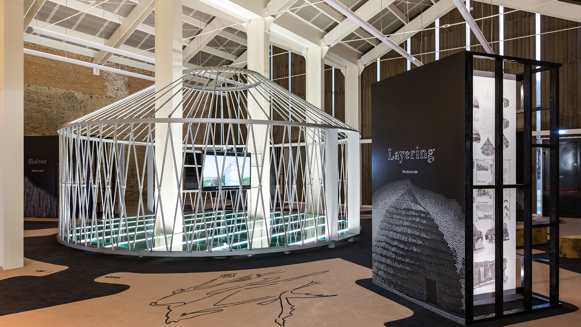 For Milan Design Week, Tod’s presented an exhibition centred on hybridisation, exploring the dialogue between traditional craftsmanship and evolving technology. Five primitive structures were reimagined with modern materials, each housing a video interview with one of eight influential creatives discussing their perspectives on contemporary life. The exhibition invited visitors to reflect, in this ever-changing world, on construction technologies and the techniques lost through the transition from manual to industrial, and now technological, building practices.